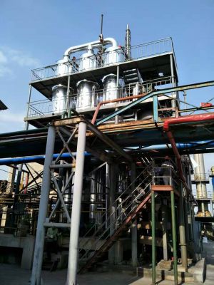 各效分汽缸、加熱器、各效蒸發(fā)分離器、冷凝器(混合式或表面式)、各效強制循環(huán)泵、各種料液輸送泵、真空泵、冷凝水泵、操作平臺、電器 儀表控制柜及界內管道閥門等組成。