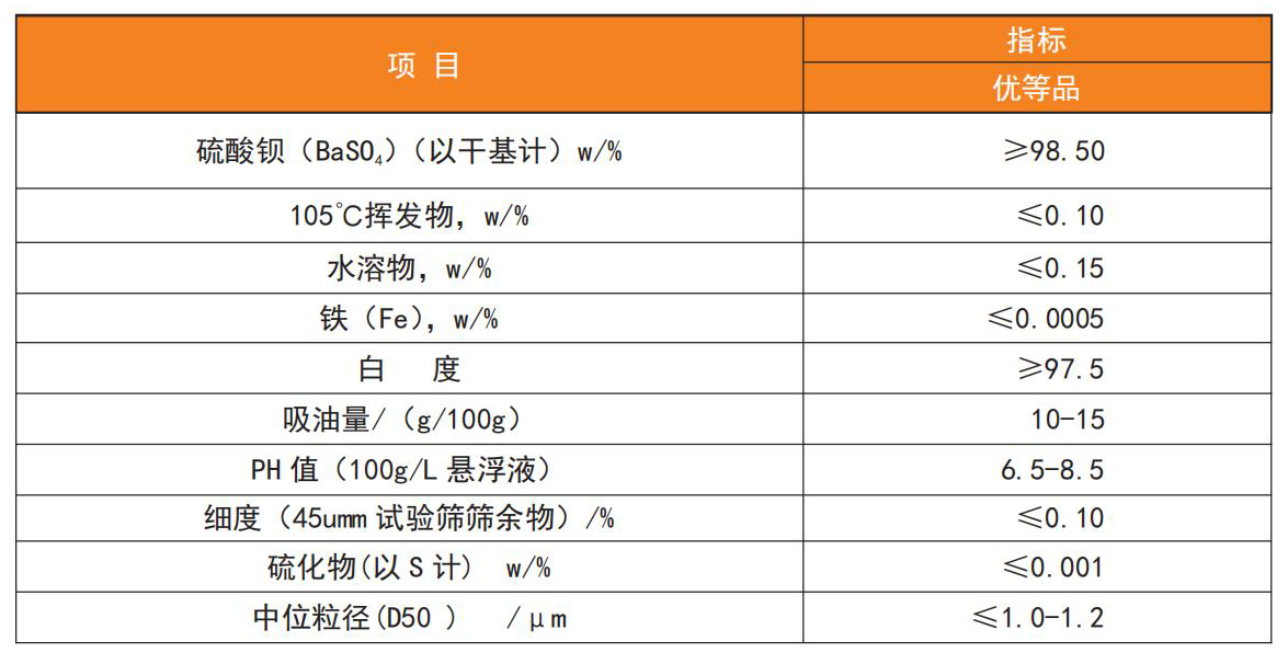 BaSO4為微白色斜方晶體、或無定形白色粉末,是唯一的無毒鋇鹽。硬度適中、高比重、高白度可作為一種中性體質(zhì)填料。15℃時相對密度為4.499,熔點為1580℃。在1150℃左右會發(fā)生多晶轉(zhuǎn)變,在約1400℃時出現(xiàn)顯著分解。25C°時,BaSO4溶度積常數(shù)Ksp=1.1×10-10。